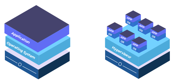 Depuis, la virtualisation est arrivée. Elle vise à reproduire numériquement un serveur, dans le serveur. Chaque machine virtuelle possède son propre système d’exploitation, et ses propres applicatifs. Il est ainsi possible, sur un seul serveur, de virtualiser autant de machines que nécessaire.